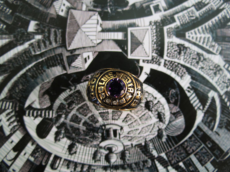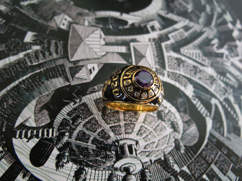 Anillo macizo en plata ley 950, con diseño personalizado en bajo relieve con 7 zircones suizos engastados y baño en oro 24k.