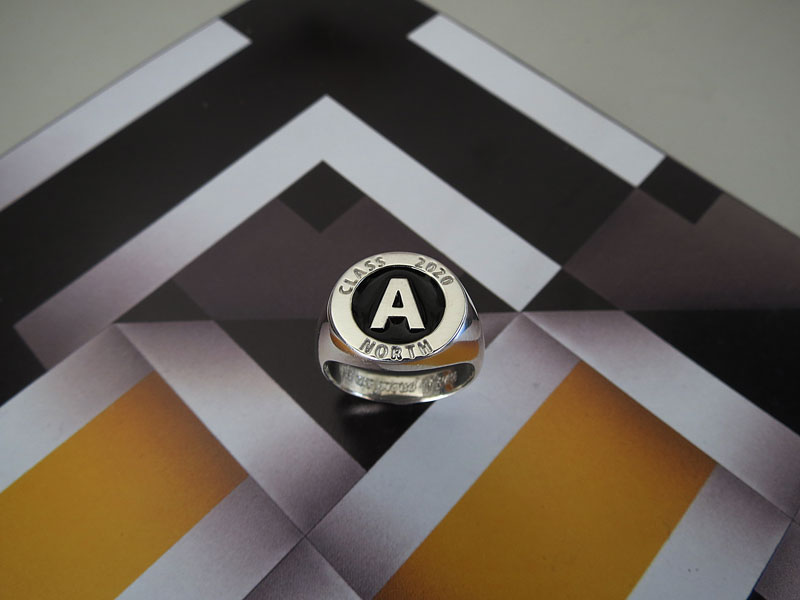 Anillo macizo en plata ley 950 con grabado personalizado en bajo relieve y grabado sencillo en el interior del aro, decorado con resina horneada.