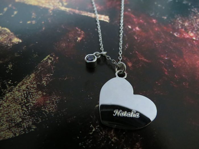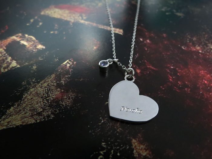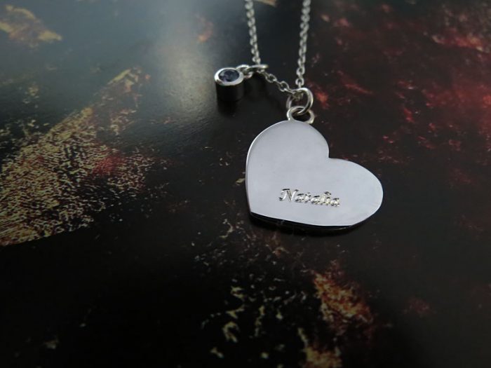 Dije cortado en plata ley 950 adornado con cadena en plata de 45cm, zircón del color que prefieras y con un pequeño grabado personalizado.