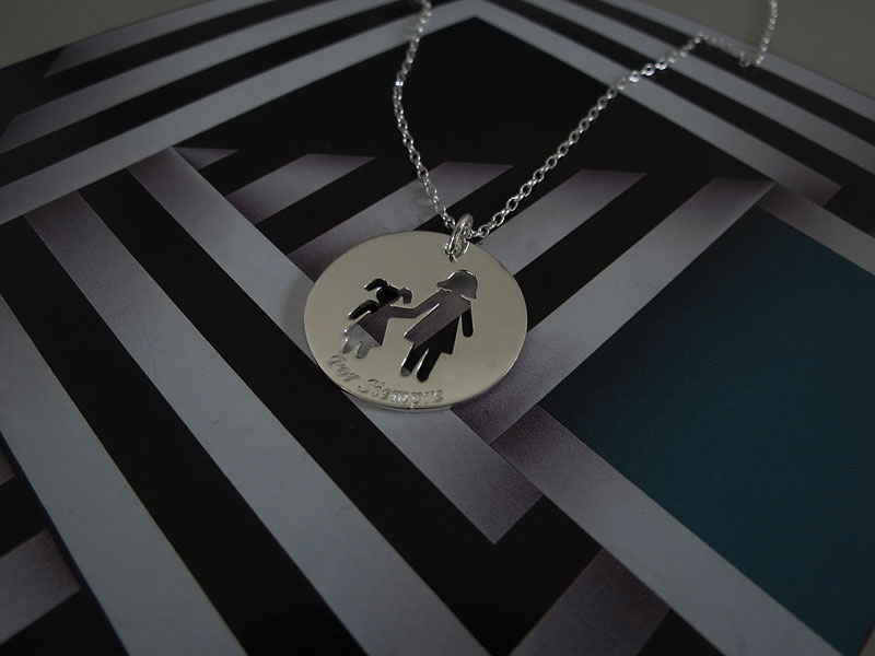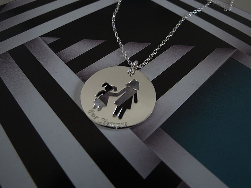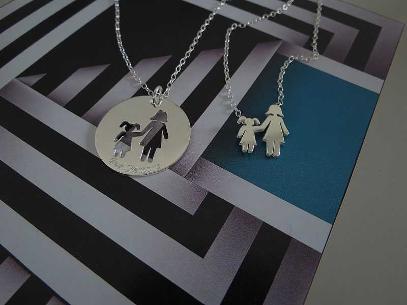 Dos collares para mamá e hija, con dijes calados personalizados y tres pequeños grabados.