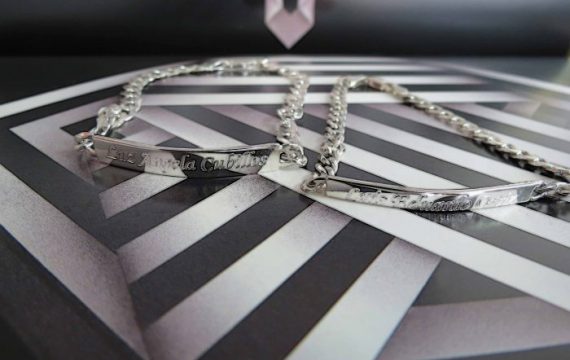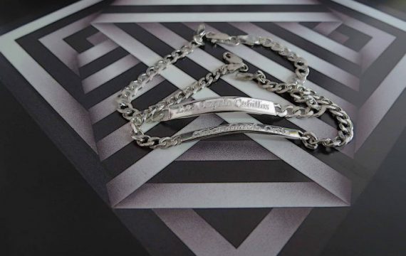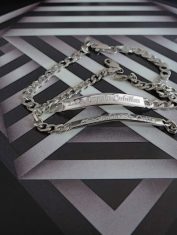 Dos esclavas macizas en plata ley con diseño grabado personalizado por una cara, y cadena eslabonada.
