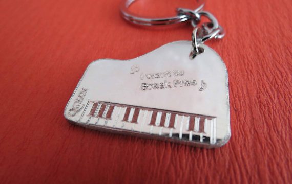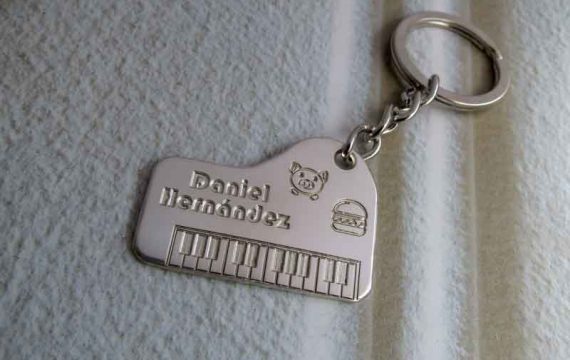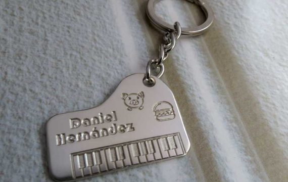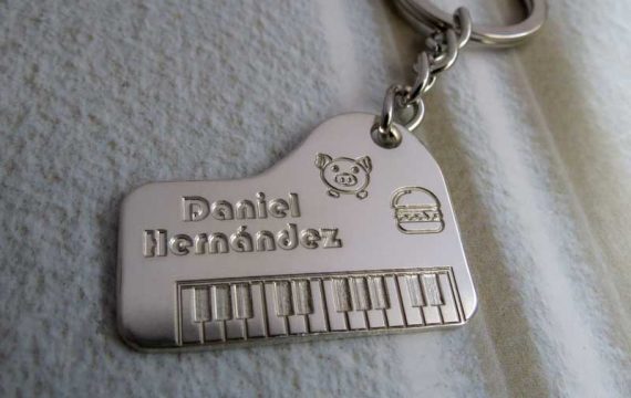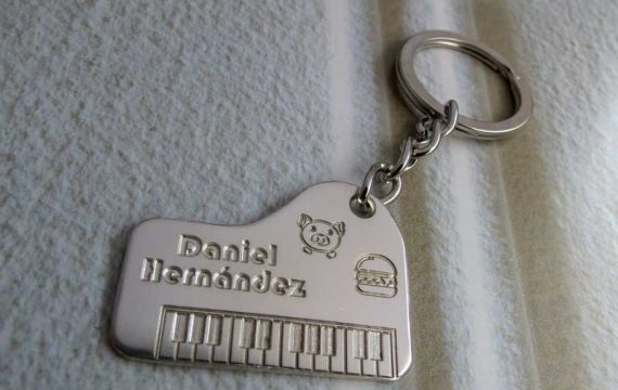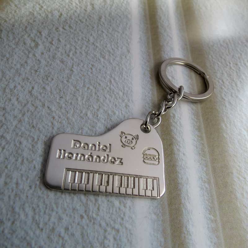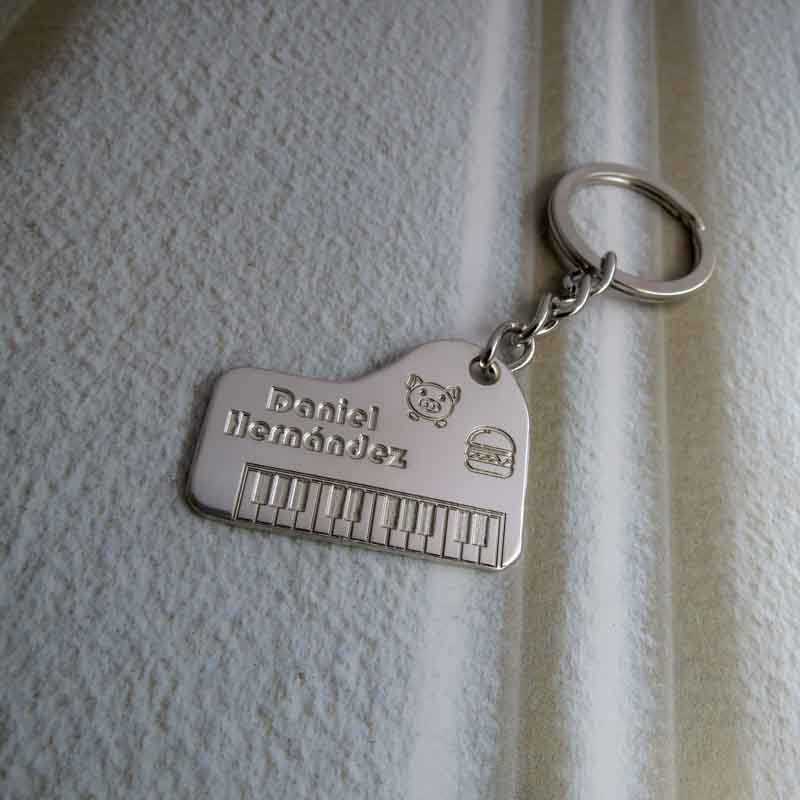 Llavero macizo en plata ley 950 con diseño personalizado grabado y silueteado de 35 mm de ancho aprox., con sistema de cadena y argolla en acero.