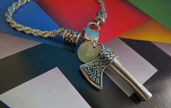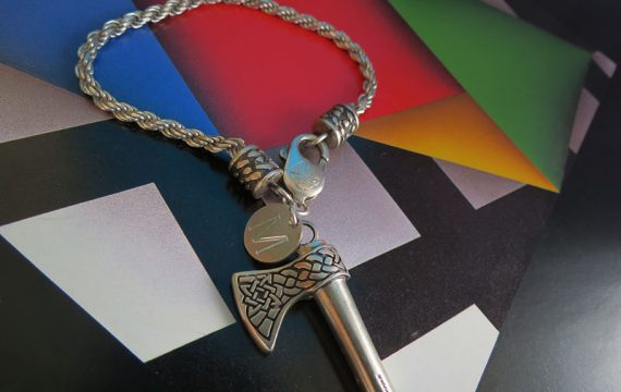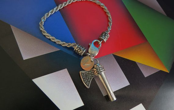 Pulsera con dije y terminales en plata ley 950 con diseño personalizado en relieve, cadena tipo lazo y picoloro grabado.