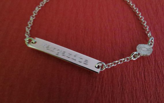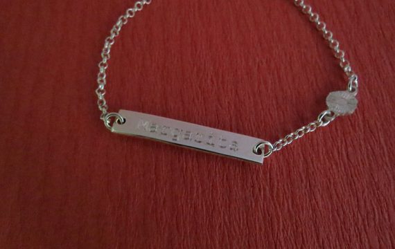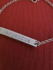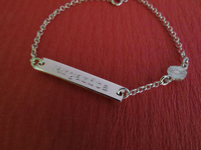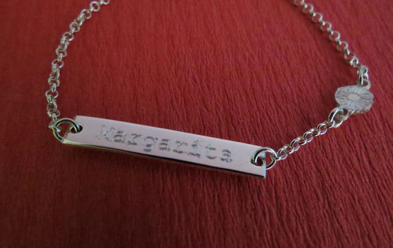 Pulsera con dijes macizos en plata ley 950, uno tipo placa con grabado personalizado, otro con grabado y silueta también personalizada, integradas a cadena eslabonada de 16 a 18cm.