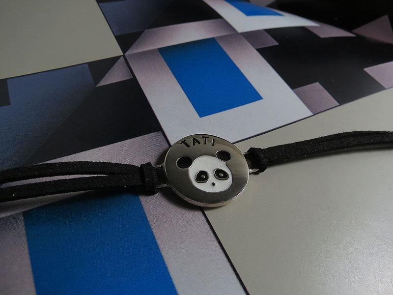 Pulsera con dije en plata ley 950 con grabado a mano decorado con resina horneada y pulso en cuero gamuzado plano. Tamaño: 2cm de diámetro aprox.