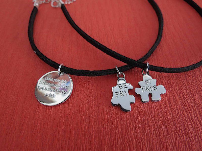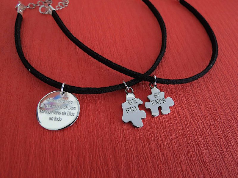 Par de pulseras elaboradas en plata ley 950, con pulso en cuero crudo del color que escojas, con una placa en plata grabada con el mensaje que prefieras.
